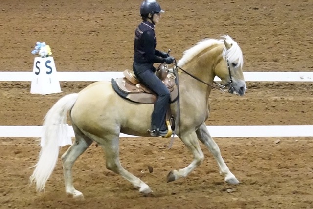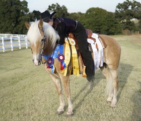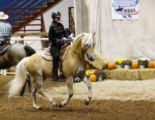 Now it was time to address the second major hurdle: Sabreena was going to need a good western saddle! Where was I, going to find a western saddle that didn’t put you in a chair seat, that had a narrow twist, and would fit a Haflinger? After doing some research and asking around in the western dressage world, I came up with the name of Mike Corcoran, a saddlemaker in Texas who owns, rides, and shows Haflingers. I called Mike and learned that he would be in the mid-west in July and was willing to meet me in southern Michigan. It just so happened I was going to a show around that time at Wyn Farm near Williamston, Michigan, so we made plans to meet there. Mike, it turns out, had a western saddle that fit Sabreena and me perfectly. He let me use it to show in that day and, wow, my scores improved. So out with old saddle and in with the new saddle. I had my saddle! Yahoo!