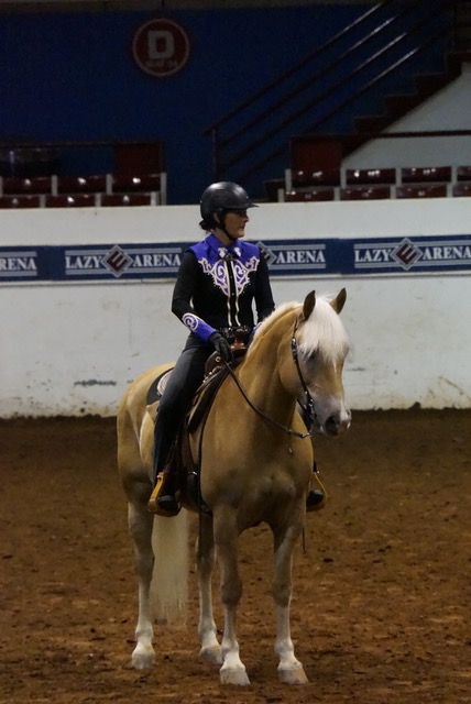 The Western Dressage World Show is held at the Lazy E Arena in Guthrie, Oklahoma the last week in September. Competitors come from all over the United States from coast to coast. There were riders from five Canadian provinces and even from New Zealand, this year! Over 40 breeds of horses were represented. The Show offers rail classes in suitability, western dressage hack and equitation, plus pattern classes, for youths and amateurs. Dressage classes range from intro to third level with three divisions: open, amateurs, and youth. There are classes for gaited horses and physically challenged riders as well. The show begins on Thursday with the rail classes and pattern classes and concludes on Sunday evening with an awards banquet for the division championships, breed awards, and state awards.